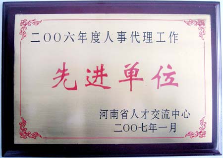 2007年1月28日,河南省人事代理先進(jìn)單位表彰大會(huì)在河南省“戰(zhàn)友大酒店”隆重召開,根據(jù)《關(guān)于表彰2006年度人事代理工作先進(jìn)單位和先進(jìn)工作才的決定》(豫人才發(fā)〔2007〕3號(hào)),我公司繼2004年度、2005年度兩次被評(píng)為“河南省人事代理先進(jìn)單位”之后,再獲此殊榮。公司人力資源部喬經(jīng)理等同志被表彰為先進(jìn)工作者。