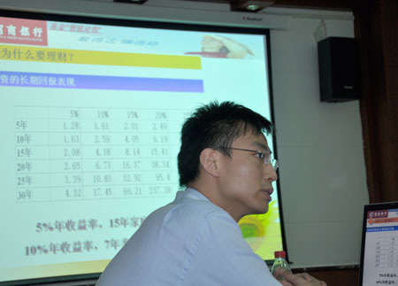 整個培訓(xùn)以探討交流的模式進(jìn)行,主講人從理財角度介紹證券的幾大分類以及投資方式,并結(jié)合自身,對特定的投資模式進(jìn)行了分析。接下來的環(huán)節(jié),主要采取提問回答的方式,根據(jù)要求,主講人回顧了前幾年的金融形勢,以前經(jīng)濟模式,簡單展望了現(xiàn)在的經(jīng)濟發(fā)展。隨后從安全性、風(fēng)險性等方面講解了基金、國債、分紅保險、存款的不同特點。整個培訓(xùn)現(xiàn)場異常火爆,大家積極發(fā)言,主講人熱情解答,贏得陣陣掌聲。