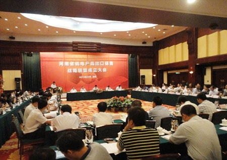 2010年8月17日上午,安陽(yáng)鋼鐵、許繼集團(tuán)、平高集團(tuán)、鄭州宇通、中信重工、黎明重工等25家技術(shù)實(shí)力雄厚、經(jīng)濟(jì)規(guī)模較大的機(jī)電產(chǎn)品生產(chǎn)企業(yè)以及中國(guó)河南國(guó)際合作集團(tuán)有限公司等20家對(duì)外經(jīng)濟(jì)合作企業(yè),在省政府、省商務(wù)廳的牽頭搭臺(tái)下,成立了“河南省機(jī)電產(chǎn)品銷(xiāo)售戰(zhàn)略聯(lián)盟”, 這一舉動(dòng)意味著今后雙方將“抱團(tuán)”開(kāi)拓國(guó)際市場(chǎng),揭開(kāi)了河南機(jī)電產(chǎn)品生產(chǎn)企業(yè)和外經(jīng)企業(yè)強(qiáng)強(qiáng)聯(lián)合、互利共贏的新篇章。宋璇濤副省長(zhǎng)、李清樹(shù)廳長(zhǎng)及相關(guān)領(lǐng)導(dǎo)出席成立大會(huì),并發(fā)表了重要講話(huà)。