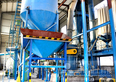 當(dāng)方解石進(jìn)入磨腔后,由鏟刀鏟起送入磨輥與磨環(huán)之間進(jìn)行碾壓,碾壓后的方解石粉隨鼓風(fēng)機(jī)的循環(huán)風(fēng)帶入分析機(jī),合格細(xì)粉隨氣流進(jìn)入旋風(fēng)集粉器收集即為成品,大顆粒物粒落回重磨。循環(huán)風(fēng)返回鼓風(fēng)機(jī)再重復(fù)以上過程,余風(fēng)則進(jìn)入袋式除塵器凈化。當(dāng)磨輥與磨環(huán)達(dá)到一定磨損后,調(diào)整高壓彈簧長度,保持磨輥與磨環(huán)之間恒定碾壓力。從而保證方解石穩(wěn)定的產(chǎn)量與細(xì)度。