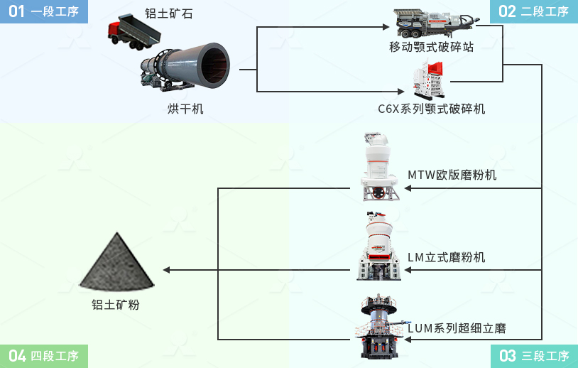 鋁土礦石加工生產(chǎn)工藝主要包括:煅燒、破碎、粉磨、成品包裝四個(gè)階段。