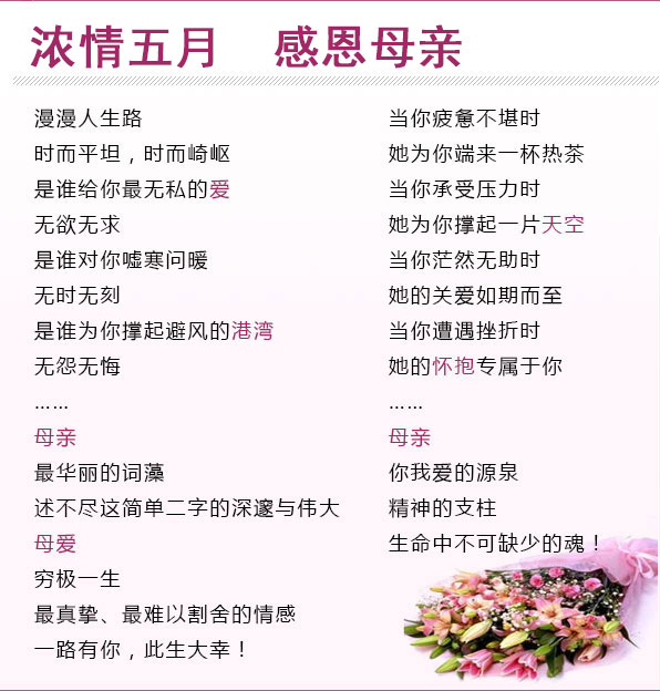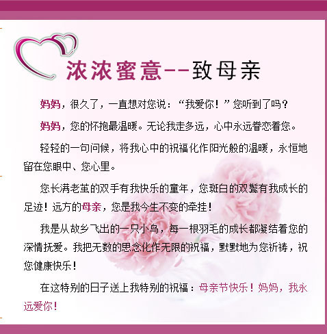 在這特別的日子送上我特別的祝福:母親節(jié)快樂(lè)!媽媽,我永遠(yuǎn)愛(ài)你!