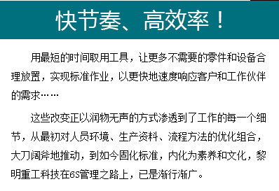 這些改變正以潤(rùn)物無(wú)聲的方式滲透到了工作的每一個(gè)細(xì)節(jié),從開始對(duì)人員環(huán)境、生產(chǎn)資料、流程方法的優(yōu)化組合,大刀闊斧地推動(dòng),到如今固化標(biāo)準(zhǔn),內(nèi)化為素養(yǎng)和文化,黎明重工科技在6S管理之路上,已是漸行漸廣。