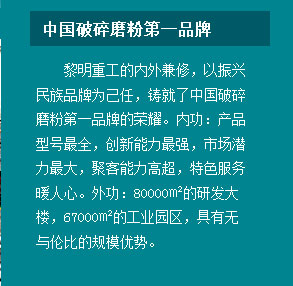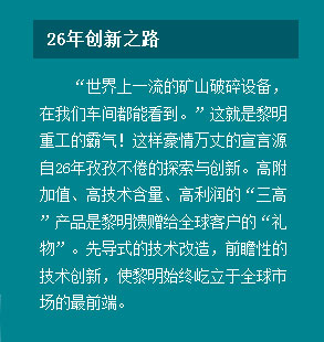 “粗中細(xì)超細(xì)碎的礦山破碎設(shè)備,在我們車間都能看到?!边@就是黎明重工的霸氣!這樣豪情萬(wàn)丈的宣言源自26年孜孜不倦的探索與創(chuàng)新。高附加值、高技術(shù)含量、高利潤(rùn)的“三高”產(chǎn)品是黎明饋贈(zèng)給全球客戶的“禮物”。先導(dǎo)式的技術(shù)改造,前瞻性的技術(shù)創(chuàng)新,使黎明始終屹立于全球市場(chǎng)的前端。