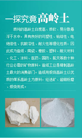 質(zhì)純的高嶺土白度高、質(zhì)軟、易分散懸浮于水中,具有良好的可塑性、粘結(jié)性、電絕緣性、抗酸溶性、耐火性等理化性質(zhì),因此成為造紙、陶瓷、橡膠、塑料、耐火材料、化工、涂料、醫(yī)藥、國防、航天等數(shù)十種行業(yè)的礦物原料。造紙工業(yè)是精制高嶺土大的消費(fèi)部門。造紙用煅燒高嶺土以品質(zhì)良好的煤系高嶺土為原料,經(jīng)選礦、超細(xì)粉磨、煅燒而成。