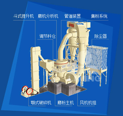 大塊非金屬礦經(jīng)顎式破碎機(jī)破碎后,由斗式提升機(jī)送至儲(chǔ)料倉,通過電磁振動(dòng)給料機(jī)均勻連續(xù)地送入磨粉機(jī)主機(jī)內(nèi)研磨,研磨后的粉末在鼓風(fēng)機(jī)的作用下吹向選粉機(jī)進(jìn)行分選。符合細(xì)度的非金屬礦粉由管道輸送到儲(chǔ)料倉;不合格的粒子重回磨粉機(jī)內(nèi)研磨。整個(gè)系統(tǒng)在負(fù)壓狀態(tài)下運(yùn)行,粉塵不外溢,從而保護(hù)了周邊環(huán)境。若經(jīng)脈沖除塵器過濾,環(huán)保效果更佳。